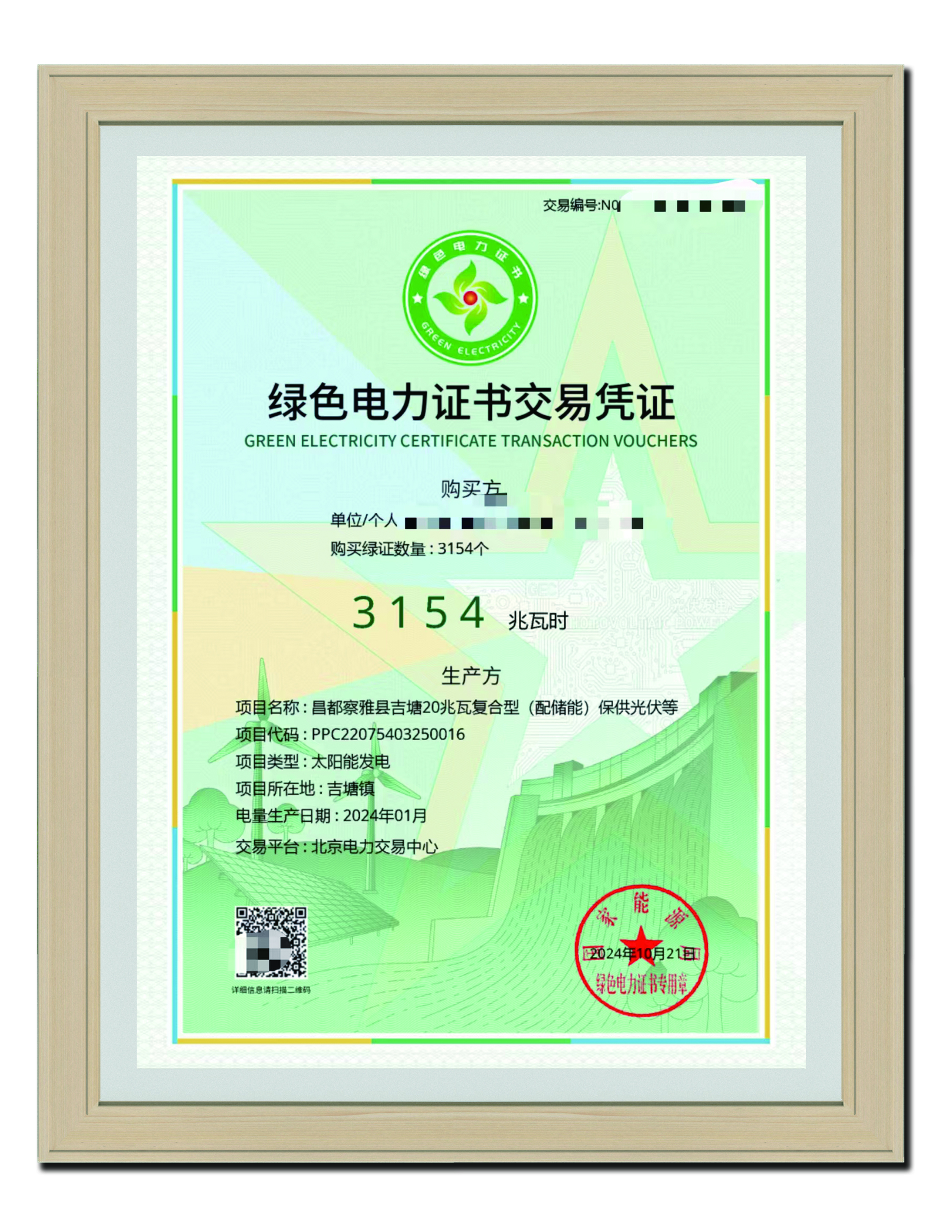 2024年10月21日 綠色電力證書交易憑證3154兆瓦時(shí)
