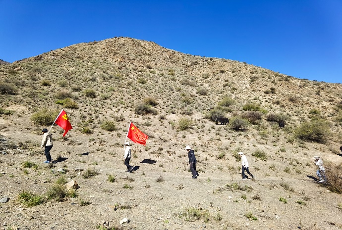 此次踏勘全程22公里,海拔垂直高度1200米。9時30分,新能源公司踏勘人員肩抗黨旗、國旗,背負(fù)測量設(shè)備和儀器從山腳沿項(xiàng)目進(jìn)場道路出發(fā)。在徒步上山過程中,天氣炙烤灼人,大家三五隨群,或健步直沖或駐足而立,或仔細(xì)測量或落筆記錄,或討論工作或抒懷暢想。大家互相幫助、互相鼓勁,隨著海拔的不斷攀升,身體負(fù)重不斷加大,氣息開始急促、腳步不再有力,每前進(jìn)一步都特別的困難,但眼前的大山壯闊雄渾,遠(yuǎn)處的冰川雪景圣潔空靈,頭頂?shù)奶炜照克{(lán)纖塵不染,讓大家心曠神怡,真切感受到高度是一種境界,攀登是一種追求,是一種“小天下”的胸懷和氣魄!