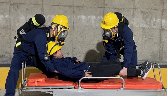 (佩戴正壓式呼吸器50米內(nèi)擔(dān)架救人競(jìng)賽 許明月攝)