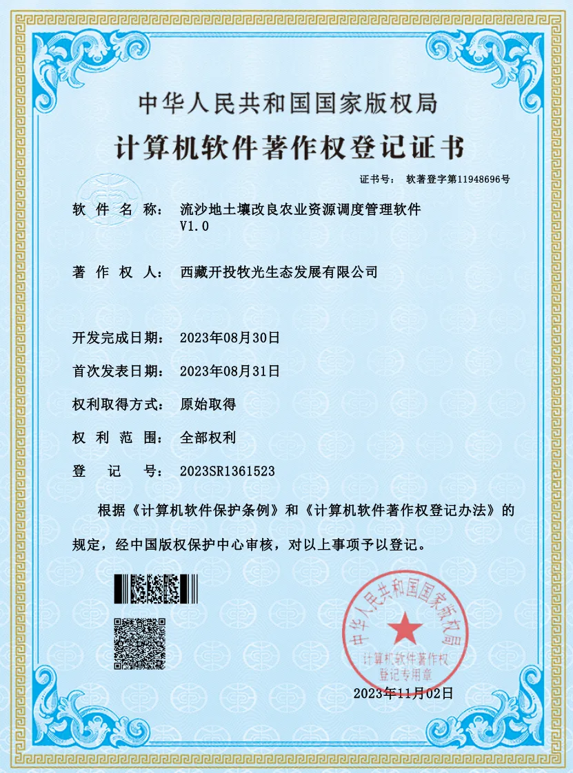 經(jīng)過(guò)一年多的摸索,西藏開(kāi)投在拉薩南北山綠化工程項(xiàng)目形成了豐富的技術(shù)成果,于近日成功申報(bào)獲取了1項(xiàng)實(shí)用新型專利和5項(xiàng)計(jì)算機(jī)軟件著作權(quán)。分別是《一種流沙地土壤有機(jī)肥混合裝置》實(shí)用新型專利和《土壤改良種植技術(shù)項(xiàng)目實(shí)施進(jìn)度跟蹤管理系統(tǒng)V1.0》《流沙地土壤改良技術(shù)數(shù)據(jù)采集分析管理系統(tǒng)V1.0》《流沙地土壤改良農(nóng)業(yè)資源調(diào)度管理軟件V1.0》《荒山種植噴灌施工計(jì)劃數(shù)字化管理系統(tǒng)V1.0》《荒山種植噴灌施工智能化控制管理軟件V1.0》計(jì)算機(jī)軟件著作權(quán)。