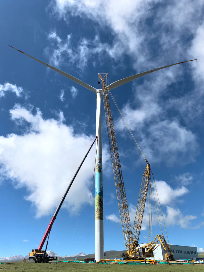 7月5日,海拔4700m的藏北高原,在一臺800T履帶式起重機(jī)與兩臺100T汽車起重機(jī)輔助下,西藏開投色尼區(qū)曲果嘎姆200MW風(fēng)電項(xiàng)目13#風(fēng)機(jī)風(fēng)力發(fā)電機(jī)組葉片與輪轂緩緩升起,于10:45順利與機(jī)艙完成對接,標(biāo)志著該項(xiàng)目首臺風(fēng)機(jī)順利完成吊裝。