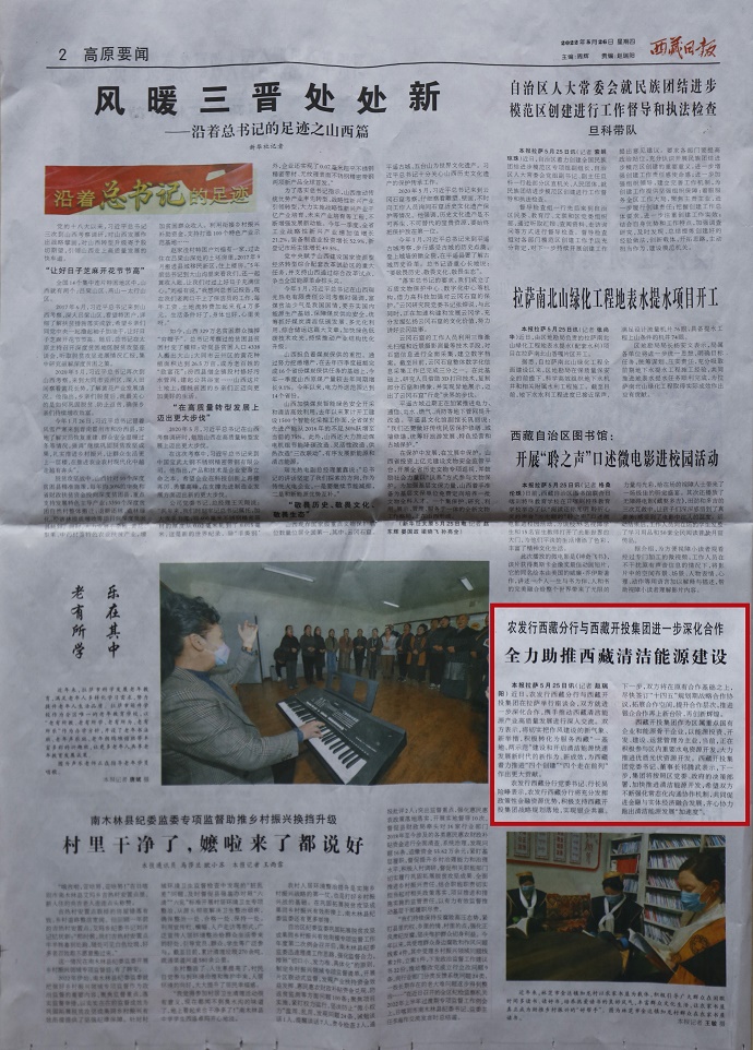 (編者按)《西藏日報》2022年5月26日在第2版“高原要聞”欄目刊登文章,報道集團公司與農發(fā)行西藏分行銀企攜手全力助推西藏清潔能源建設。全文如下: