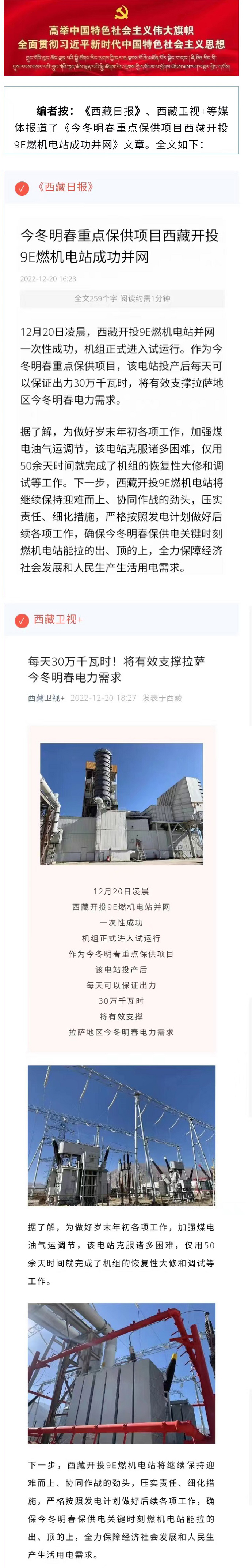 《西藏日報》、西藏衛(wèi)視+報道今冬明春重點保供項目西藏開投9E燃機電站成功并網(wǎng)
