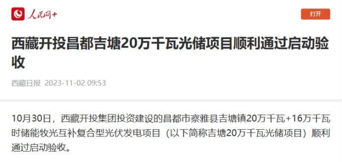 人民網(wǎng)、中國(guó)西藏新聞網(wǎng)、西藏日?qǐng)?bào)客戶端報(bào)道了《西藏開(kāi)投昌都吉塘20萬(wàn)千瓦光儲(chǔ)項(xiàng)目順利通過(guò)啟動(dòng)驗(yàn)收》