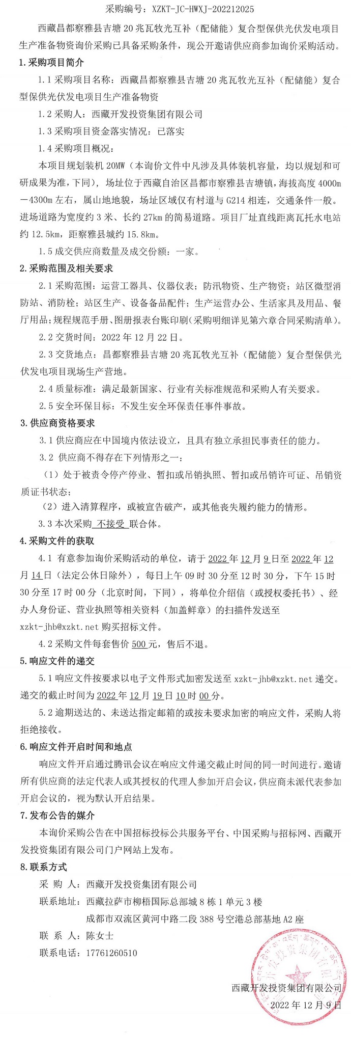 光伏發(fā)電項目生產(chǎn)準(zhǔn)備物資詢價采購公告