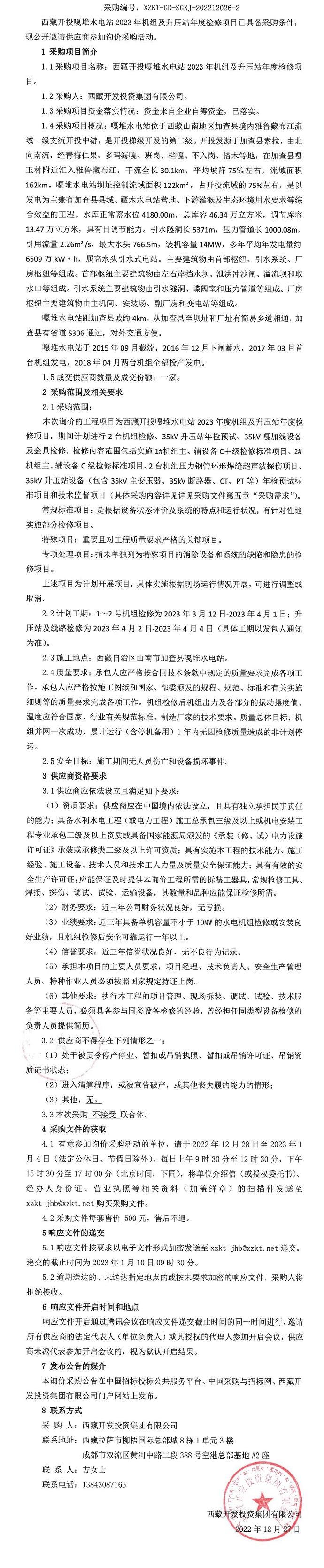 西藏開投嘎堆水電站2023年機(jī)組及升壓站年度檢修項目詢價采購二次公告