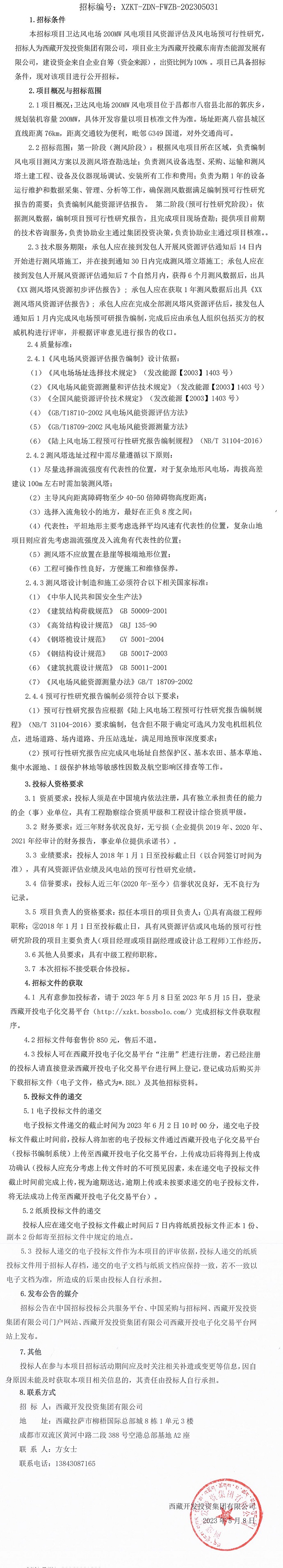 衛(wèi)達風電場200MW風電項目風資源評估及風電場預可行性研究招標公告
