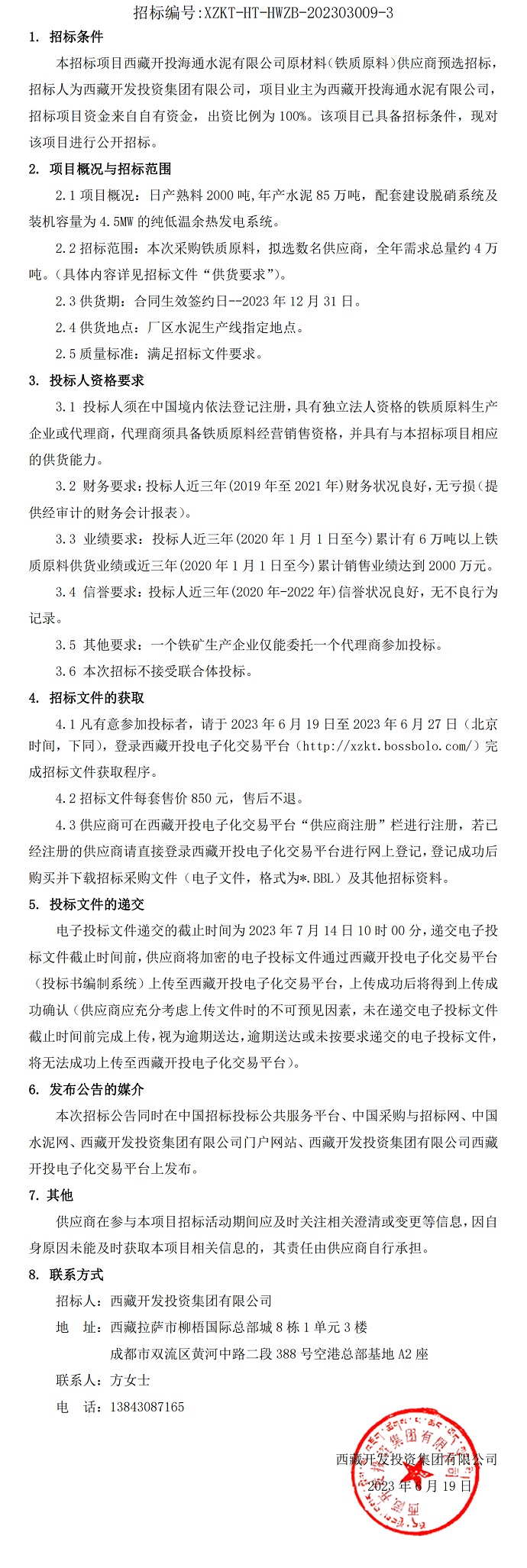 西藏開投海通水泥有限公司原材料(鐵質(zhì)原料)供應(yīng)商預(yù)選招標公告