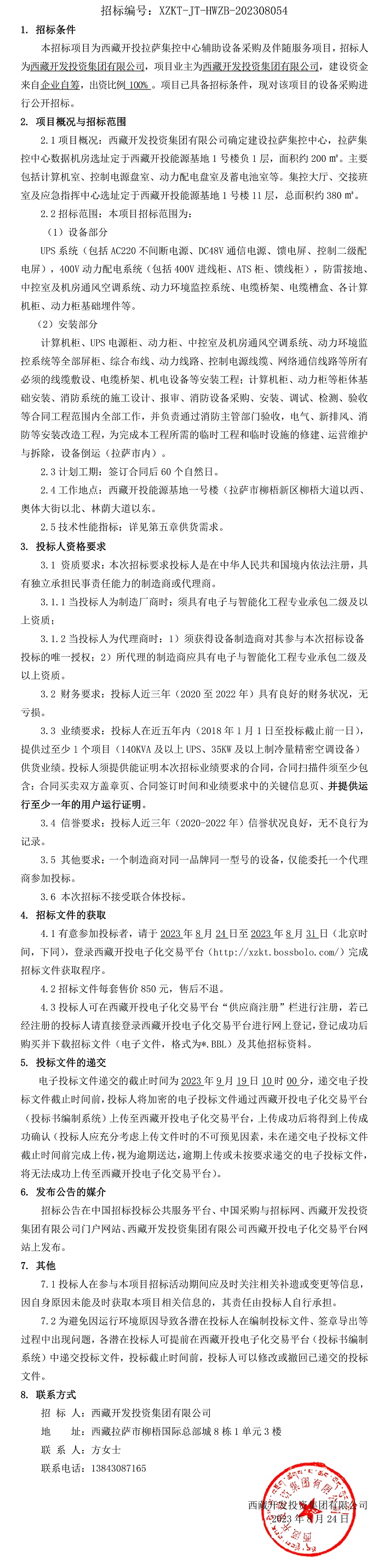 西藏開發(fā)投資集團(tuán)有限公司拉薩集控中心輔助設(shè)備采購及伴隨服務(wù)項目招標(biāo)公告