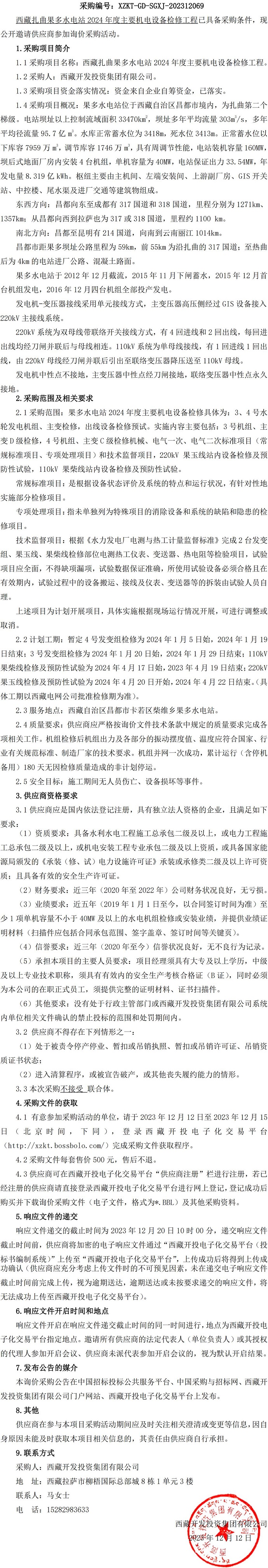 西藏扎曲果多水電站2024年度主要機(jī)電設(shè)備檢修工程詢價(jià)采購(gòu)公告