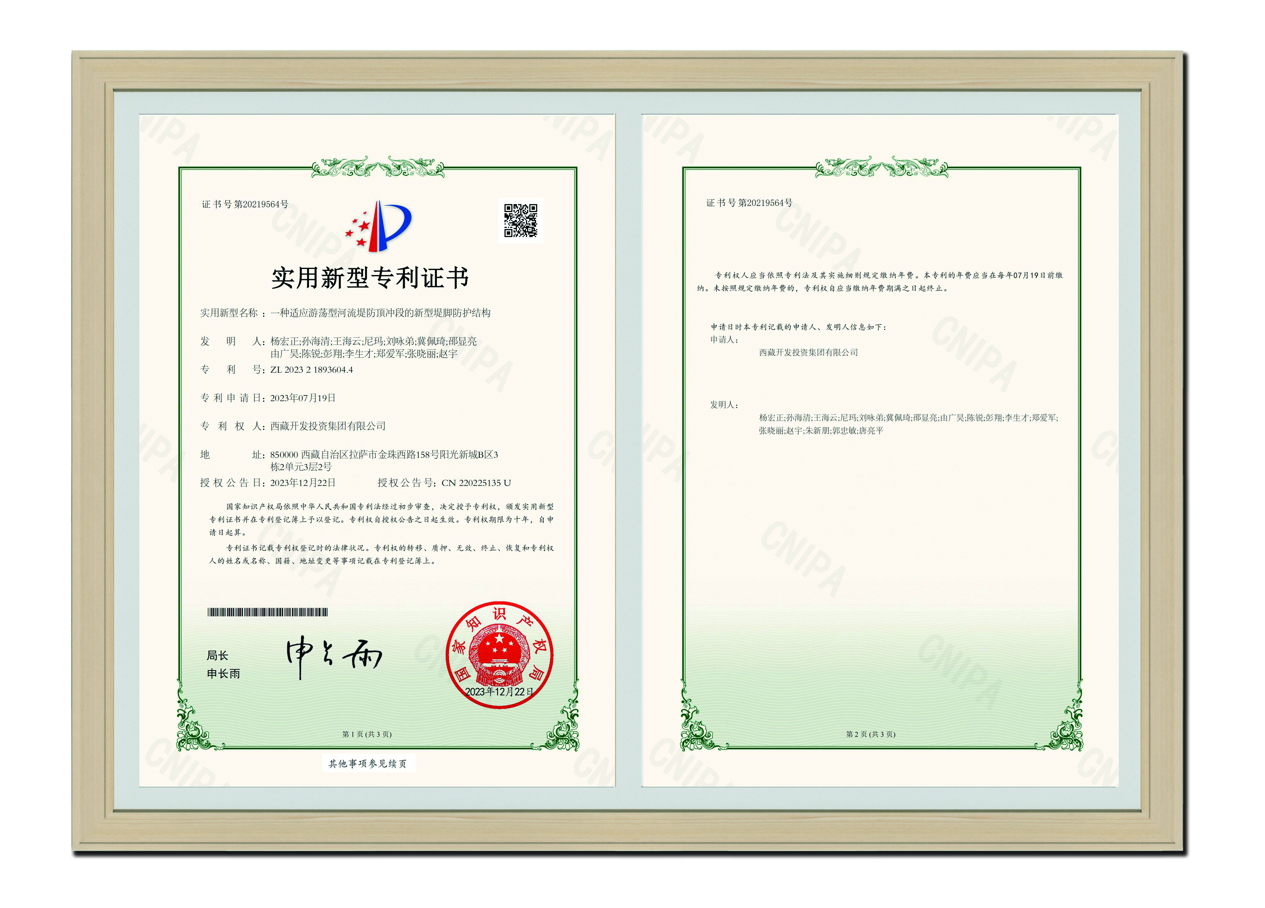 2023年12月22日 一種適應(yīng)游蕩型河流堤防頂沖段的新型堤腳防護(hù)結(jié)構(gòu)-實(shí)用新型專利證書(shū)