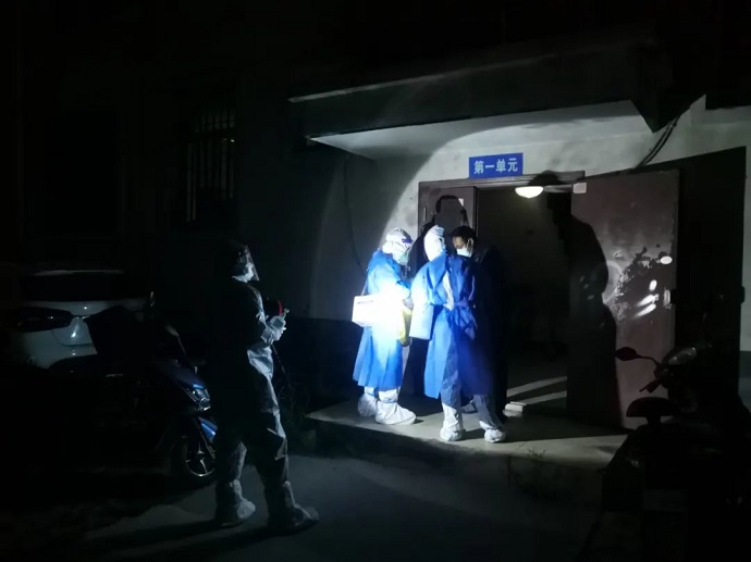 在做好防護(hù)準(zhǔn)備后,扯起嗓門開始耐心的給即將入睡的百姓做起動(dòng)員。在疫情期間,經(jīng)歷了漫長的等待,蝸居在家的市民大多習(xí)慣了早晚無序的核酸檢測,但還有不少以身體不適、經(jīng)不起“磨煉”等理由進(jìn)行躲避、抗拒,隊(duì)員們不厭其煩,只能冒著風(fēng)險(xiǎn)逐戶登門做思想工作。舉燈踱步、排門逐戶做完檢測一眨眼三個(gè)多小時(shí)過去了,再做好試管封裝,數(shù)據(jù)統(tǒng)計(jì)、校對后已至子夜后半段,深秋微涼的晚風(fēng)已被隊(duì)員的熱情牢牢抵御在防護(hù)服之外。