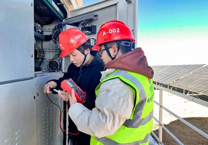 ▲噶爾光伏項(xiàng)目,現(xiàn)場(chǎng)施工人員檢查儲(chǔ)能設(shè)備。