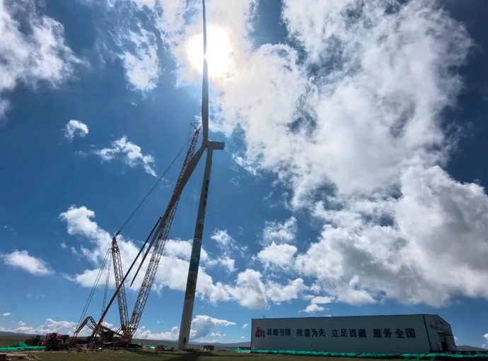 7月5日,海拔4700m的藏北高原,在一臺800T履帶式起重機(jī)與兩臺100T汽車起重機(jī)輔助下,西藏開投色尼區(qū)曲果嘎姆200MW風(fēng)電項(xiàng)目13#風(fēng)機(jī)風(fēng)力發(fā)電機(jī)組葉片與輪轂緩緩升起,于10:45順利與機(jī)艙完成對接,標(biāo)志著該項(xiàng)目首臺風(fēng)機(jī)順利完成吊裝。